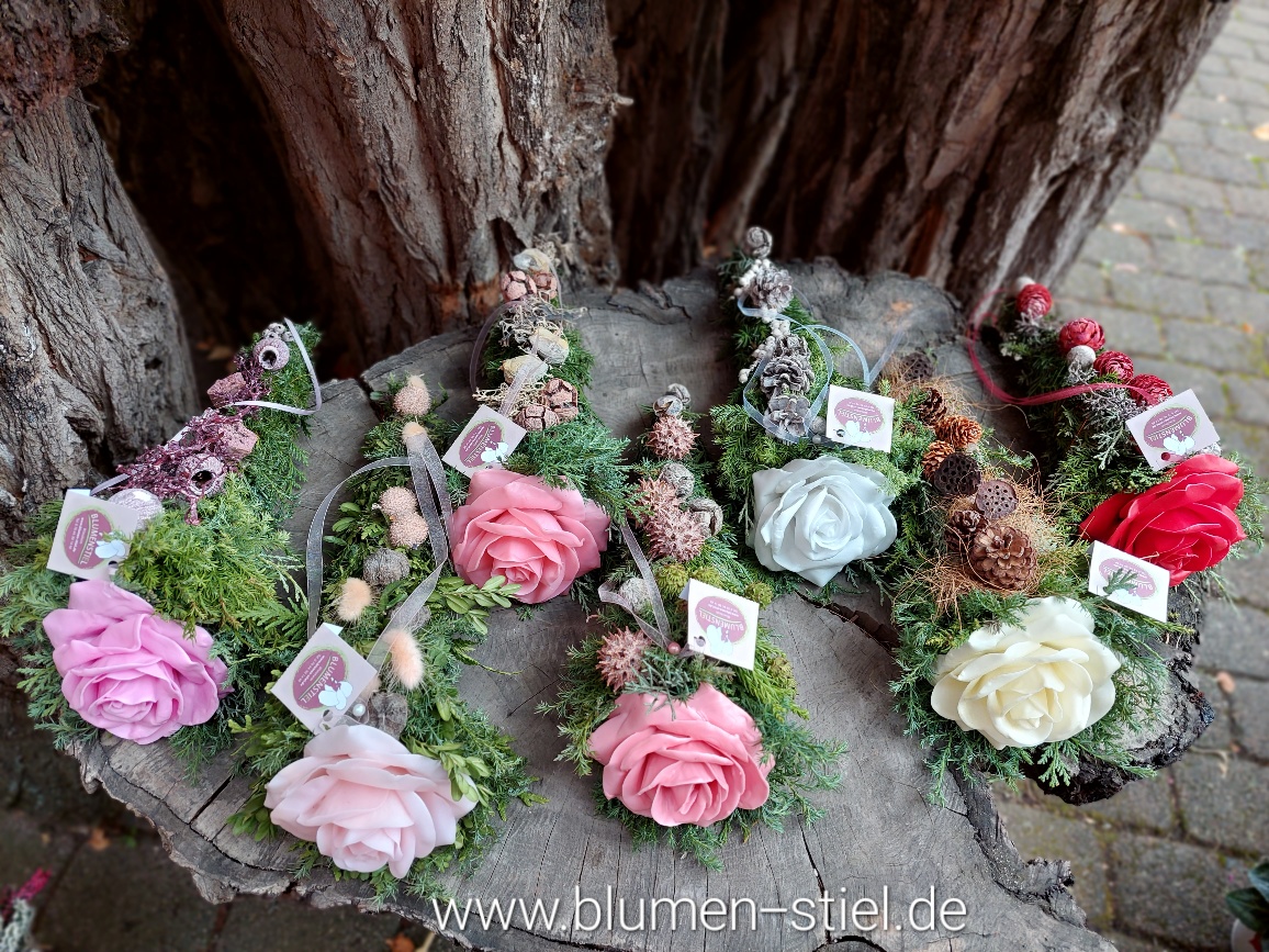 Gebunden mit z.B. Nordmann-/Nobilistanne und Koniferengrün aus dem Schwarzwald, dekoriert mit kleinen Zapfen, Beeren, Moos etc. passend zur Farbe der Rose.